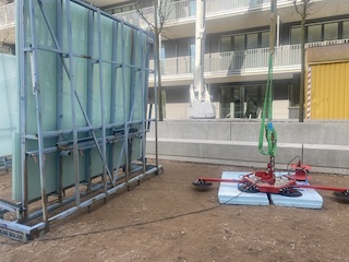 hier stand der Kran auf einem Tiefgaragendach, das nicht schwer belastet werden durfte: ideal für zB. Glastrennwände, hier mit Akku-Glassauger - der eine Kranöse hatte!