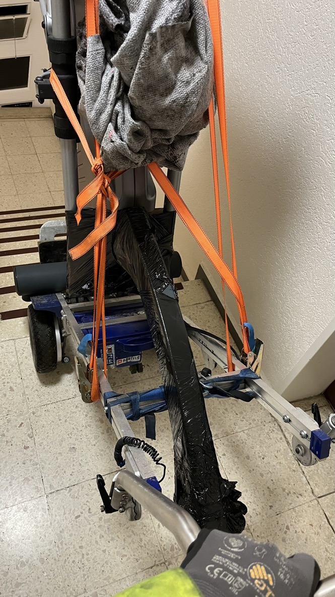 Einsatz auf schmaler Holz-Wendeltreppe – oft wendiger als Raupentechnik.